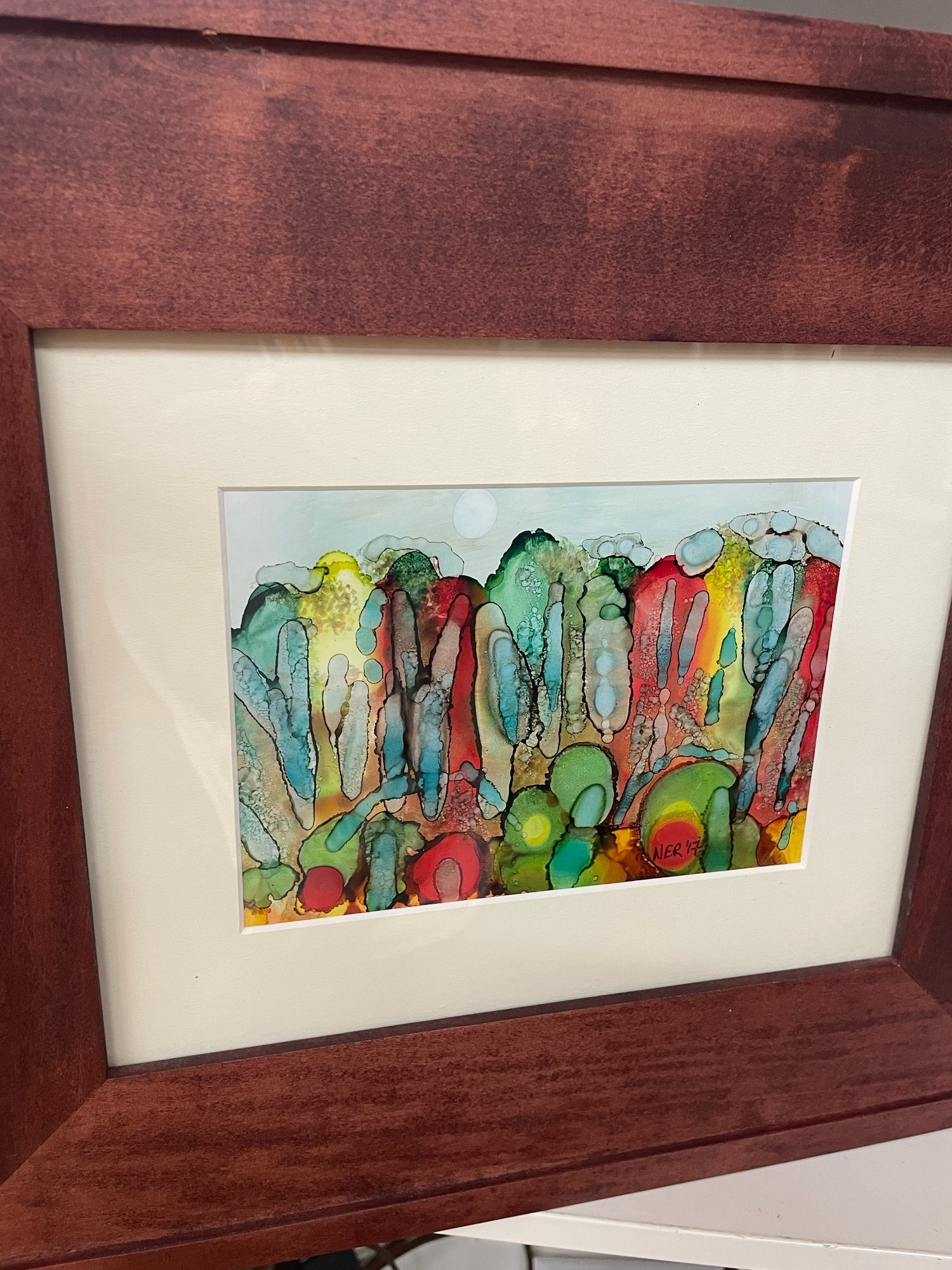 Red/blue/green abstract bubbles picture in wood frame