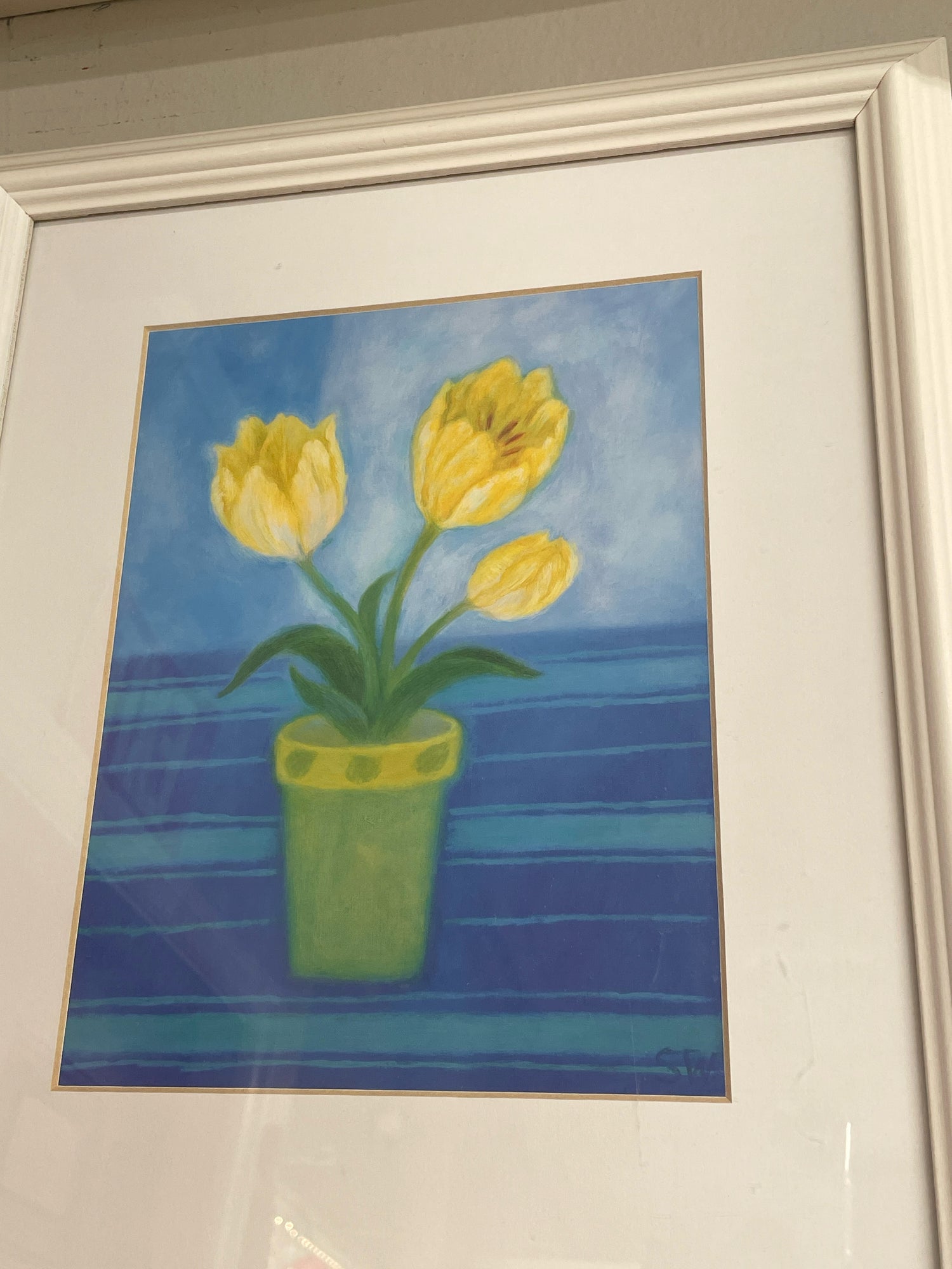 Yellow flower in green planter picture in white frame