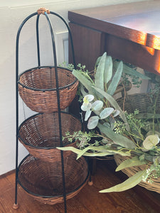 Black metal tiered stand with 3 wicker bowls